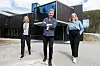 GLADE VERTSFOLK: Leiar Kristian W. Rantala, program- og vertskapsansvarleg Åsne Vesaas (t.v.) og digital formidlar Line Omland Eilevstjønn gler seg til å ta imot publikum på det nye senteret for dikting og journalistikk i Vinje. I bakgrunnen til høgre på biletet kan ein skimta statuen av diktaren og journalisten Aasmund Olavsson Vinje som saman med fleire andre store diktarar frå området får ei sentral rolle i arbeidet til senteret. Foto: Yngve Vogt / NPK