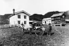 Haugen i Morgedal – 1887: Frå venstre: Aasta Omtveit f. Haugen, Ingebjørg (på armen), Ingebjørg Haugen (bestemor) med Birgit (dotterdotter) på armen, Torleif Omtveit med hest.