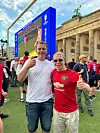 Historisk: Jørgen Aamot og Erik Due frå Kviteseid såg EM-finalen på Brandenburger Tor i Berlin sundag.