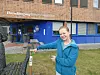 Stolpejakt: Eva Marie Lyngestad ved ein grøn stolpe ved kommunehuset i Åmot. Stolpane er plasserte både i tettbebygde strøk og ute i ville naturen. – I fjor var det 70 stolpar og det er moro å sjå at eg sankar poeng etter kvart som eg registrerer stolpane eg har funne, fortel 12-åringen.