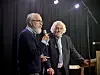 Takka for besøket: — Eg veit ikkje om du skriv med penn, spurde leiaren i Nissedal mållag Harald Valle (t.v.). Han gav forfattar Edvard Hoem ein penn laga av Valebjørk frå Treungen. — Jau, eg gjer det sa Hoem og takka for gåva.