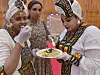 Kokken må og spise: Selemawit Hadera Tsegai (tv) og Yodit Habte Gebrandarias (th) sørga for både injera og eritreisk kaffi. Letegebrel Yohannes (i midten) besøker «stasjonen» deira.