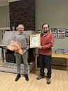 Gamal og ny leiar: John Thronsen (t.v.) vart heidra som æresmedlem i Nissedal idrettslag av den nye leiaren i laget Lars Gunnar Veum.