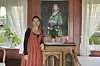 Solveig Barstad framom måleriet som bestefaren har måla av bestemora inne i spisesalen på Nutheim gjestgiveri. Kokeleringa har gått i arv frå mor til dotter i fire generasjonar. Kjøkenet baserer seg på norske og lokale råvarer med ein fransk vri.