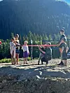 Hjelpte ordføraren med å klippe snora: Magnhild Mostøyl (f.v.), Rannei Vinjerui, Emilia Utistog, Olav Utistog (midten), Jarand Felland, Augond Mostøyl og Svein Olai Austjore.