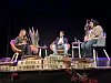 På litteraturdagane: – Dette er stemmer som har blitt forsøkt undertrykt. Eg tenker det er kraft i det at dei kan stå på ei scene her og tale fritt. Slik vart dei to friby-forfattarane introdusert. Benedikte Nes (t.v.)leia samtala med Tesfaldet G. og Somaya El Sousi.