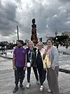 Framom monumentet over the battle of Ava står (f.v.) tryggleiks- og tilgangsrådgjevar for Kirkens Nødhjelp i Etiopia Adoninas Adugna, sokneprest i Rauland Nina Kirkerød, landsdirektør for Kirkens Nødhjelp i Etiopia Margrethe Volden og Åshild Dale.