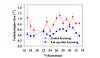 Figur 1. Middel trekkfart når dyra kryssar stien Haukelister-Hellevassbu-Litlos (raudt) og i log periodane som byrjar 6 og 3 timar før eller 3 og 6 timar etter kryssing (blått) i høve til vekenummer. Data frå og med 2001 til og med 2020, for GPS merkte simler med 3 timars log intervall. Standardfeil er markert.