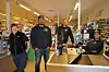 Mellombels: Gjermund Bergsland (t.h.), Knut Lauvrak og Kjell Magne Lie er tre av fem menn som måtte overta drifta av Joker Fyresdal, då dei fast tilsette damene der tura til Hardanger i to dagar. Butikkerfarne Glenn Roger Bergland var til god hjelp for mennene.