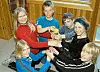Kirsten Grythe (7. klasse, t.v.), Eldbjørg Kiland (6.), Øyvind Levang (6.), Joar Gjersund (7.), Gunhild Susanne Mikkelsen (6.) og Jan Henrik Storøygard Lie (5.) i gruppa Gangetabellen prøvar å finne ut korleis ballen kan vere innom alle hendene på minst mogleg tid.