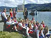 Nissedal hornmusikk sit på Fjone-sida og ventar på at bussen skal kome etter på ferja. Korpset er van med ein lang og krevjande 17. mai der det slit seg gjennom kilometer med gange.