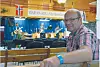 Tarjei Draugedal gjer seg klar til torsdagens kveldsmøte. På scenen står Kviteseid-bandet med Kenny Pollestad, Svein Heggtveit, Anne Heggtveit og Marlon Pollestad.