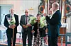 Fyresdalordførar Erik Skjervagen stod for overrekkinga av minnemedaljar under festgudstenesta. Frå venstre er Andreas Breiland, Leif og Signe Sølyst og Gunnar Sandvik.