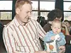 Vesle Saamund Rorge Tjønn undersøkjer puta han fekk som ny innbyggjar nummer 8 etter at kulturutvalet i Øyfjell City i fjor byrja markere dei nyfødde i bygda. Han sit på fanget til faren Jan Ove Tjønn.