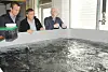 Plutseleg opplevde dagleg leiar Mads Dorenfeldt Jenssen (t.h.) og styreleiar Lars Bjaadal stor interesse for aksjekjøp i Telemarkrøye. Fylkesordførar Sven Tore Løkslid er imponert over Fyresdal-verksemda der han står og ser ned i eit kar med stamrøye frå Fyresvatn.