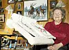 Tomine Gaaren meiner broderinga er viktig for å kunne halde på det gode humøret og den positive tonen ho er kjent for å ha. Hjorte-broderiet hennar i bakgrunnen har over 53.000 sting, eit venstrehandsarbeid av høg klasse.