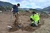 Stort funn: Det var Asle Økelsrud (t.v.) som gjorde det største funnet som viser seg å vera anten ein kam eller eit knivhandtak i reinsdyrgevir med punktnaglar i bronse. Ragnar Orten Lie følgjer spent med når karane melder om funn.