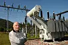 Kjempetung: Fyresdalordførar Erik Skjervagen (Ap) ved transformatorstasjonen på Einangsmoen ikkje langt unna Molandsmoen industriområde. Trafoen som det nå er snakk om å få til datasenteret i bygda, er av ei heilt anna vekt – heile 151 tonn.