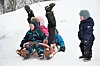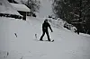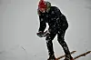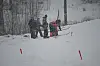 Det kjem åtte namn på lista i vaksenklassa også, men dei kjem ikkje langt før fyrste uhell skjer. Allereie i skuterheisen opp bakken blir det knall og fall, og dei fleste endar med å bere skia til topps.