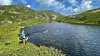 Midtpunkt: Tjønna på nedsida av Hestenutan er Telemarks midtpunkt, ifylgje Statens kartverk. Her nyttar nokon i turlagsfylgjet høvet til ein dukkert på veg til fjellnuten.