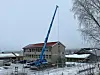 Byrja på heisen: Måndag denne veka starta arbeidet ved hjelp av ei kjempekran å få på plass heis ved murbygget. Det er full fart i jobben med ulike oppgåver ved storskulen i Treungen.