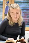 Signe Tjønn (21) har lest ut fleire bøker i veka heilt sidan ho var lita, og har brukt biblioteket i Åmot flittig både til boklåning og som hengeplass med vener. For henne er lesing ein måte å kople av på.