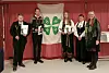 Fem i finstasen: Plakettmottakarane Hans Martin Olsen, Sondre W. Evja og Johanna L. Krossbakken saman med styreleiar for Telemark 4H Iselin Byggstøyl og Anne-Nora Oma Dahle (Sp) frå Telemark fylkesting. Foto: Privat