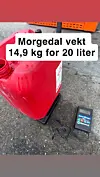 Ved hjelp av digital vekt fann me fyrst ut at ein liter diesel veg 820 gram, og dersom ein nulla ut vekta med tom kanne, fylte 20 liter frå fyllestasjonen, skulle vekta vise 16,4 kilo.