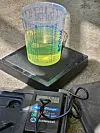 Onsdag kveld fann VTB sin journalist og Åmot fram fire like 20-literskanner og ei digital vekt for å kontrollere kor mykje 20 liter frå pumpestasjonen veg for å kontrollere eksakt mengde diesel som kjem ut.