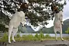 Flott skue: Per Punglaus (t.h.) og dei fire damene hans må du rekne med å møte på fram mot fellesferien om du ferdast på Tangane. - Det er mange som er nedom og tek bilde av dei, seier Grunde Seltveit, som er medeigar av geiteflokken.