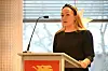 På talarstolen: Varaordførar Carina Thorvaldsen (Frp) forklara kvifor posisjonspartia Høgre, Frp og Ap gjekk for kommunedirektørens innstilling om å oppretthalde dagens barnehagestruktur og ikkje bygge ut Flatdal barnehage