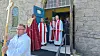 Vigsling: Det var Ingar Hovda (t.v.) som bar prosesjonskorset under seremonien i Kviteseid sundag. På trappa står biskop Stein Reinertsen, ny sokneprest i Kviteseid, Sigrun Lønning Solvang, tidlegare sokneprest Møyfrid Lunde og prost Asgeir Sele.