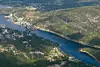 Fire alternativ: Eine alternativet er tenkt til venstre, gang- og sykkelbru over til Treungen sentrum. Dei tre andre alternativa ligg aust for Tveitsundbrua. Til høgre er Øyna.
