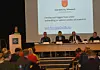 Desentralisering: Beate Marie Dahl Eide (Sp) og resten av posisjonen ynskjer å flytte fylkeskommunale arbeidsplassar til Øvre Telemark. På dirigentbordet sit Jan Sivert Jøsendal, fylkesvaraordførar Sven Tore Løkslid (Ap), fylkesordførar Terje Riis-Johansen (Sp) og Iren Hagen.