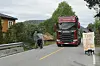 Håkon Haugo (tv) og Stian Hauge skapar ein reell situasjon ved Mattisbrua. Under aksjonen telde dei også talet på lastebilar, vanlege bilar og mjuke trafikantar.