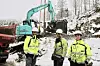 Gamal trafo og stolpar i Høydalsmo blir erstatta med ny nettstasjon av VTK-tilsette Bjørnar Kilen Midtbøen (t.h.) og Rune Aalandslid. Dei har fått nettsjef Gunnar Snarteland (t.v.) på besøk.